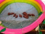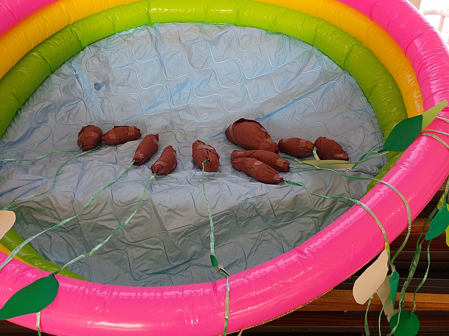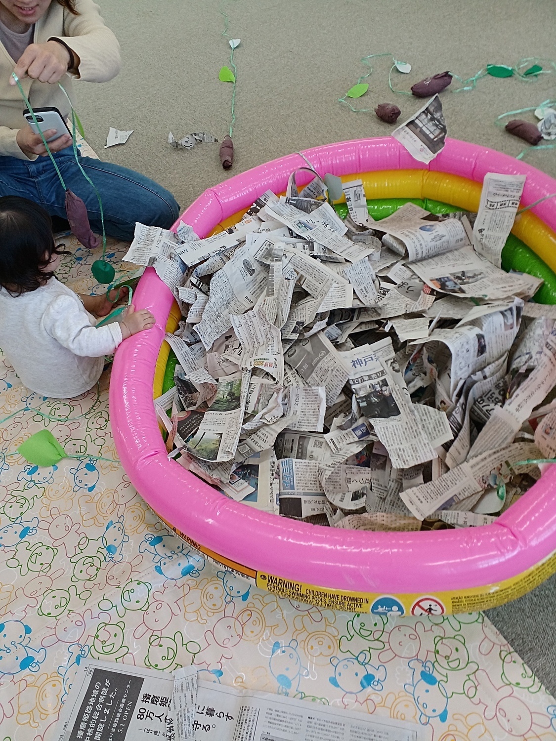 ビニールプールにおいもと、つるに模した緑のビニールひも。土をかぶせるため、新聞びりびりして、小さい子は、びりびりするだけで、笑顔!大きい子は、えい!と自分の手を振り下ろして、びりーー!と破る方式で、たくさんびりびり新聞を作って、おいもほりの上に散らしました。そのあとは、お芋ほり。どんどん抜けました。