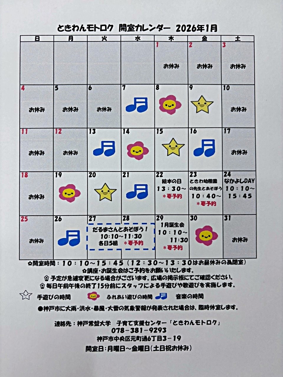 ☆14日〜16日、20日〜23日、27日〜30日は神戸常盤大学の学生さんと一緒に遊べます。ぜひお越しください^ ^