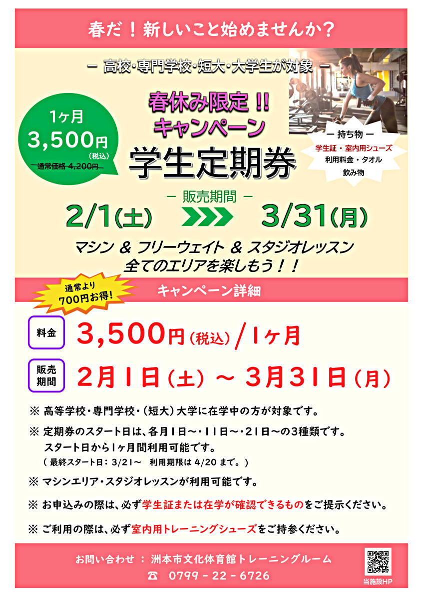 洲本市文化体育館トレーニングルームでは2月と3月限定で、高等学校・専門学校・(短大)大学に在学中の学生を対象に、春休みの特別定期券を販売致します。