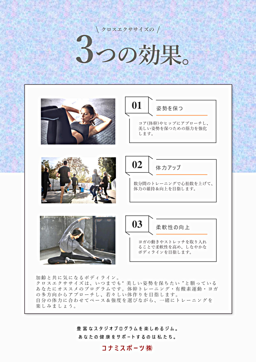 「クロスエクササイズ」はいつまでも【美しい姿勢を保ちたい】と願っている方にオススメのプログラムです。〔体幹トレーニング〕で姿勢を保つための筋力を養い、〔有酸素運動〕で体力を維持向上を図ります。〔ヨガ〕の動作で柔軟性を高めて、しなやかな体を作っていきます。