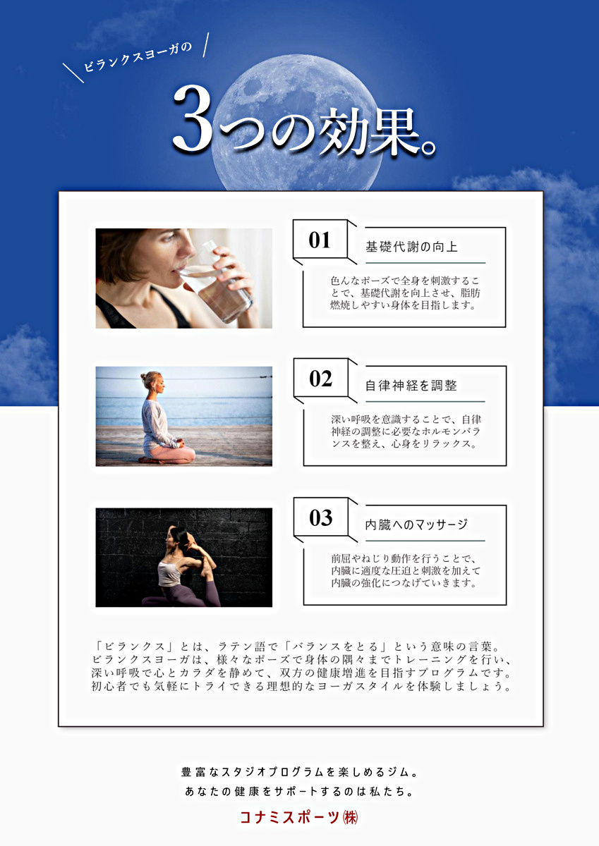 〔ビランクス〕とは、ラテン語で「バランスをとる」という意味の言葉です。様々なポーズでご自身の体の調子を、自分で整えて向上させていきます。週に一度だけ、ご自身のためのマインドフルネスとリラクゼーションを行ってみませんか ? お気軽に施設までお問い合わせください。