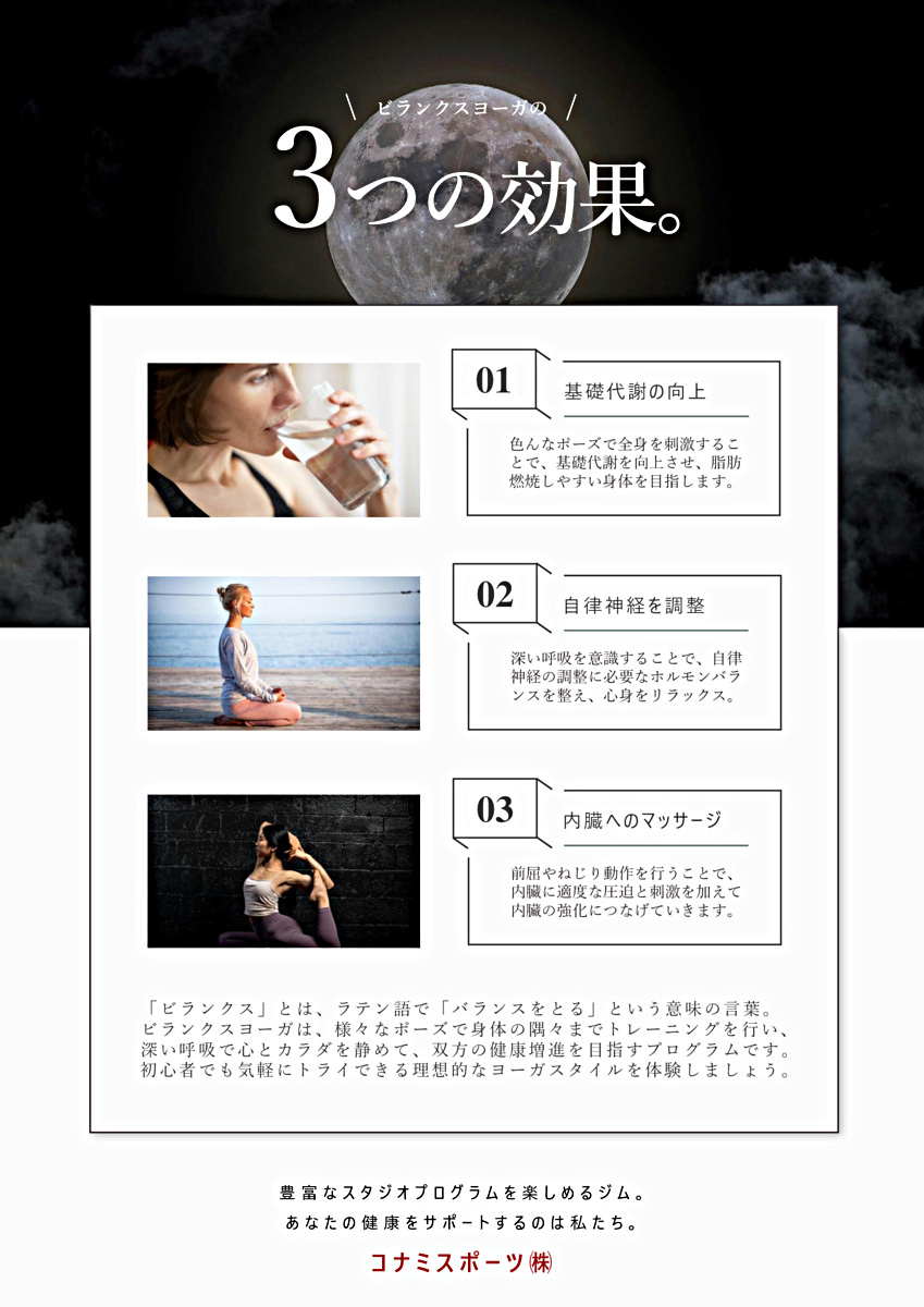 〔ビランクス〕とは、ラテン語で「バランスをとる」という意味の言葉です。様々なポーズでご自身の体の調子を、自分で整えて向上させていきます。週に一度だけ、ご自身のためのマインドフルネスとリラクゼーションを行ってみませんか ? お気軽に施設までお問い合わせください。