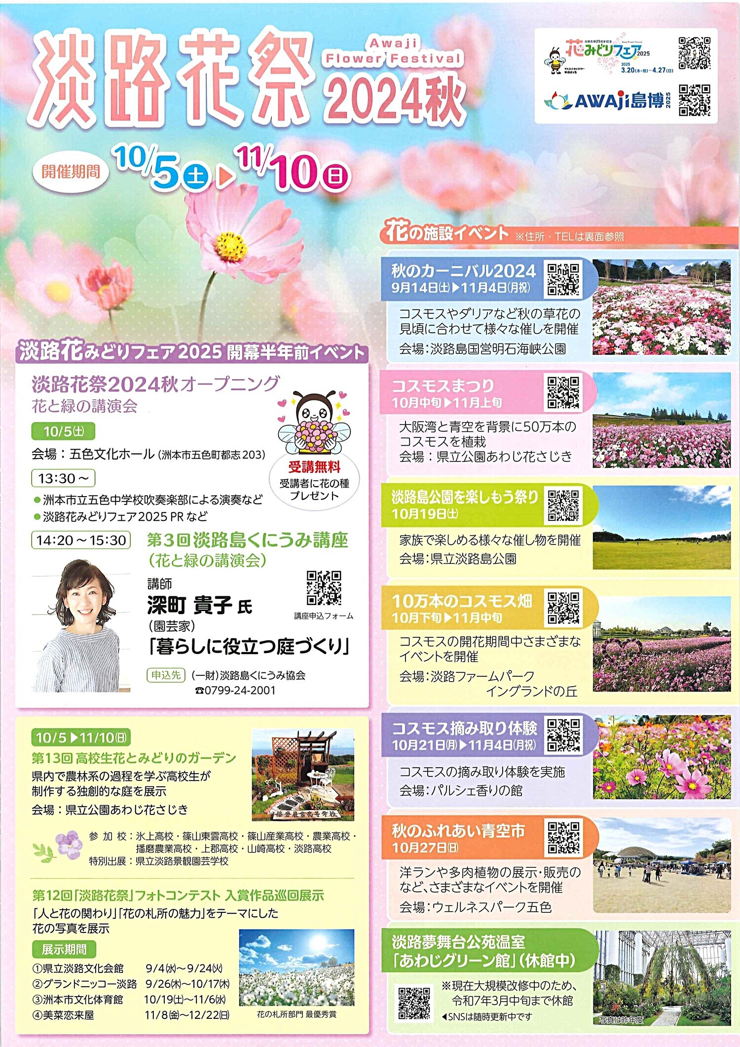 コスモスなど秋の花の開花に合わせ、10/27(日)にウェルネスパーク五色で開催される「秋のふれあい青空市」をはじめ島内各所で多彩なイベントを開催します。