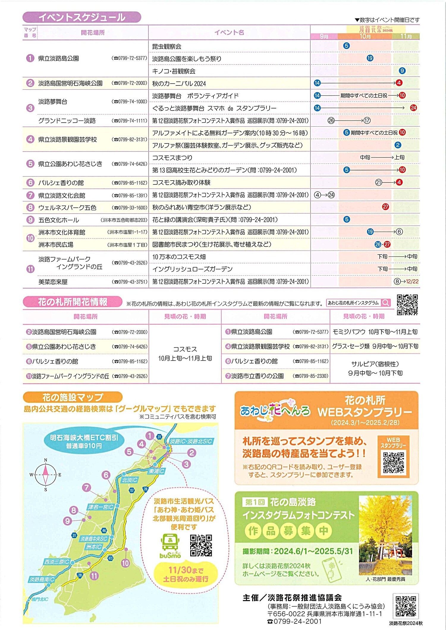 県立公園あわじ花さじきでは「コスモスまつり」や県内高校生が制作した庭の作品展示もあります。また「淡路島内にある花の名所等の魅力」が伝わる写真をインスタグラムで募集するフォトコンテストなど多彩なイベントが行われます。期間中、開放的な空間と秋花の中でくつろぎの時間を過ごしてみては。