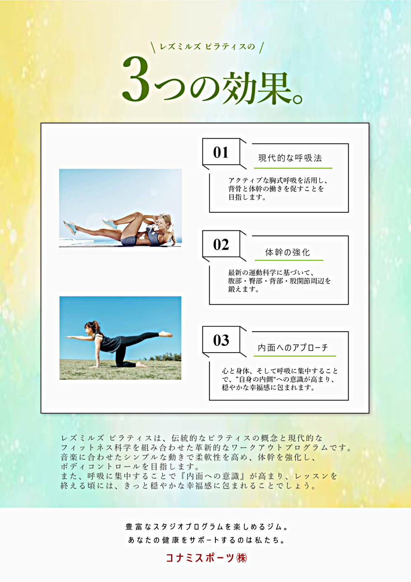 世界のフィットネスを常に牽引するレズミルズプログラムから、女性に待望のピラティスプログラムを洲本市文化体育館トレーニングルームで導入しました。