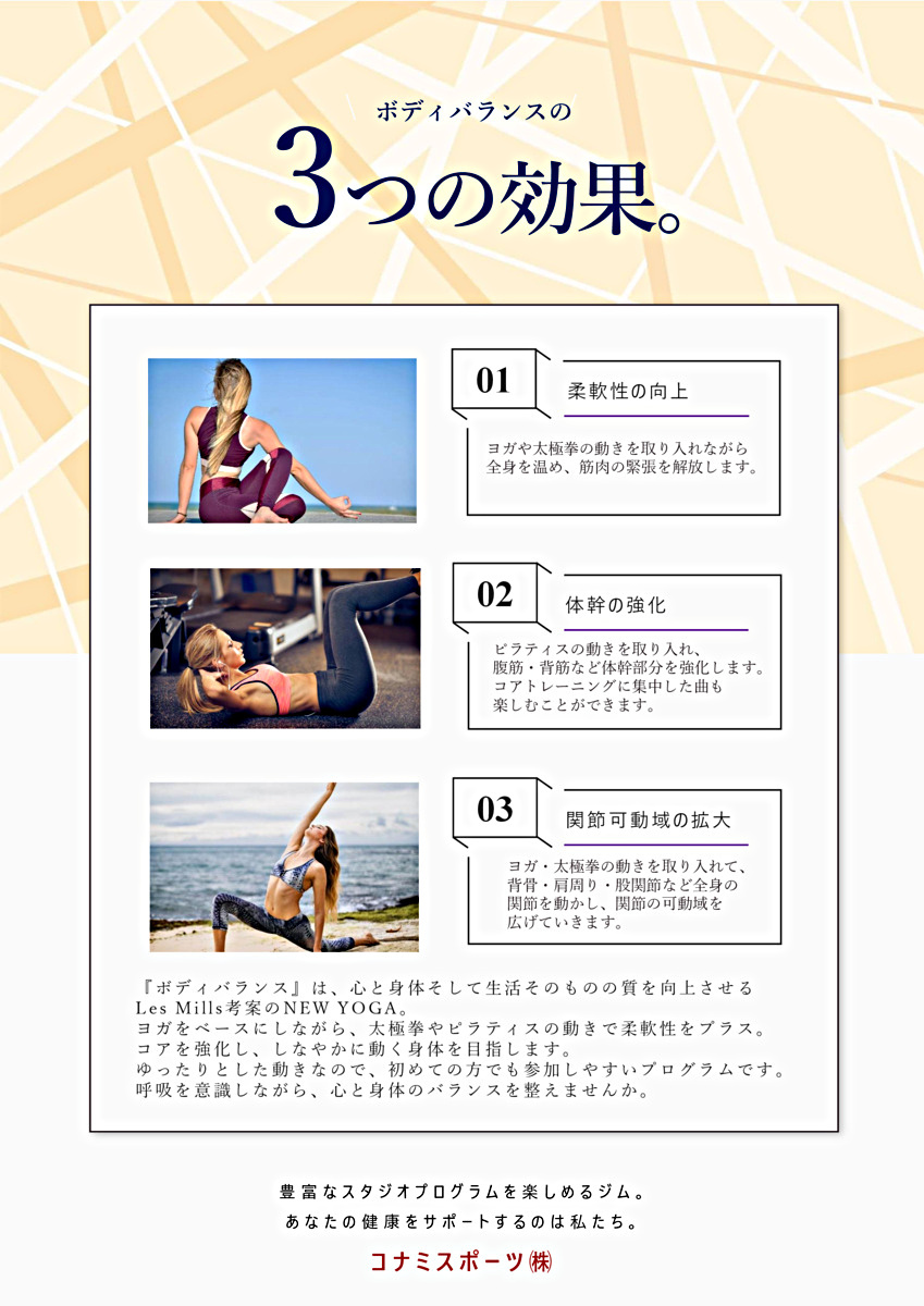 世界のフィットネスを常に牽引するレズミルズプログラムから、女性に人気のプログラムである『ボディバランス』が大人向けスクールで登場。ヨガ・太極拳・ピラティスの動きを取り入れ、心地よい音楽と共に、心と身体のバランスを整えるヒーリングプログラムです。