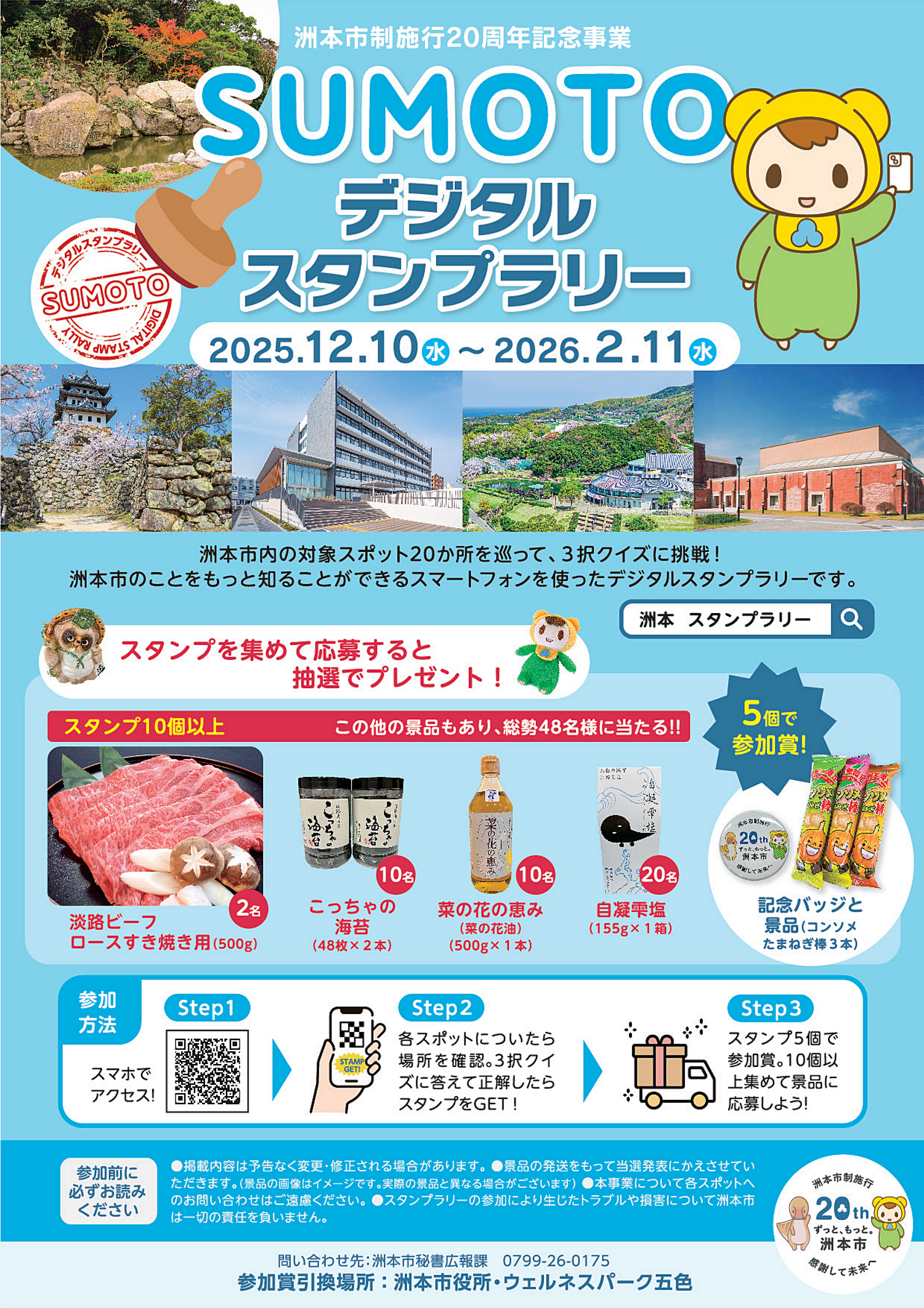 洲本市は、旧洲本市と五色町が合併して令和8年2月に市制施行20周年を迎えます。これを記念して、スマートフォンを使った「デジタルスタンプラリー」を開催します。
