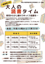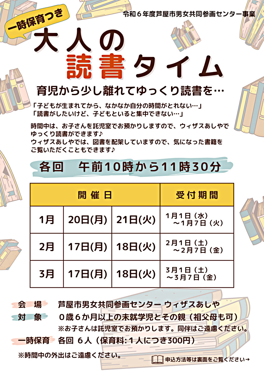 時間中、お子さんを託児室でお預かりし、お父さん、お母さんにゆっくり読書をしていただく事業です♪