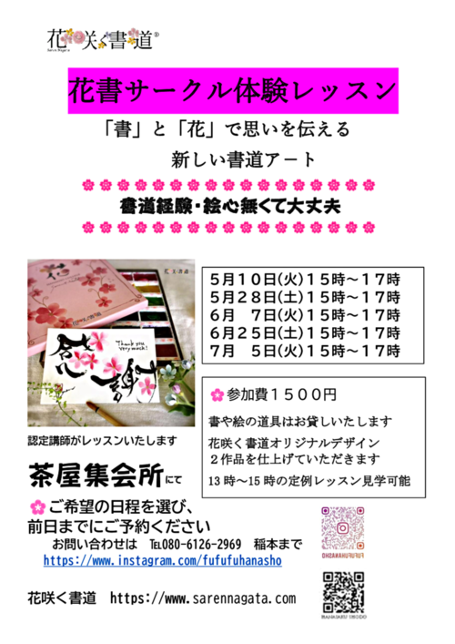 「花咲く書道 花書サークル体験レッスン」書と花で思いを伝える新しい書道アートを体験してみませんか? 書道経験・絵心無くて大丈夫です。書や絵のお道具はお貸しします。筆記用具(鉛筆等)のみお持ちください。