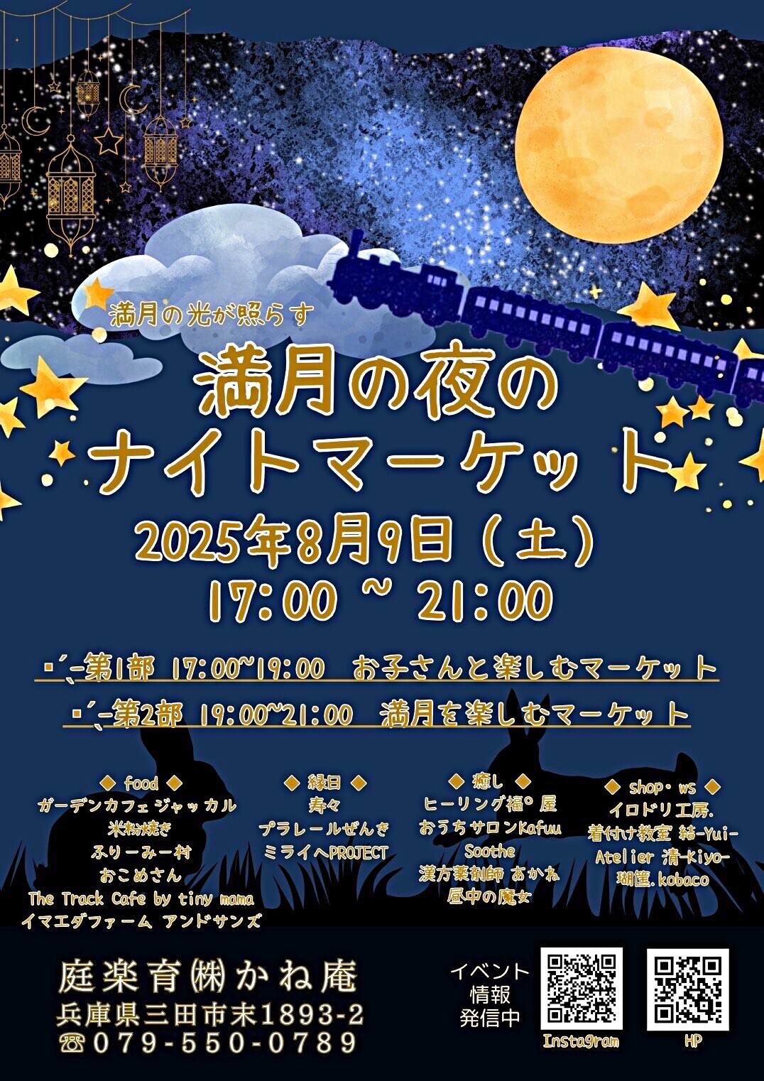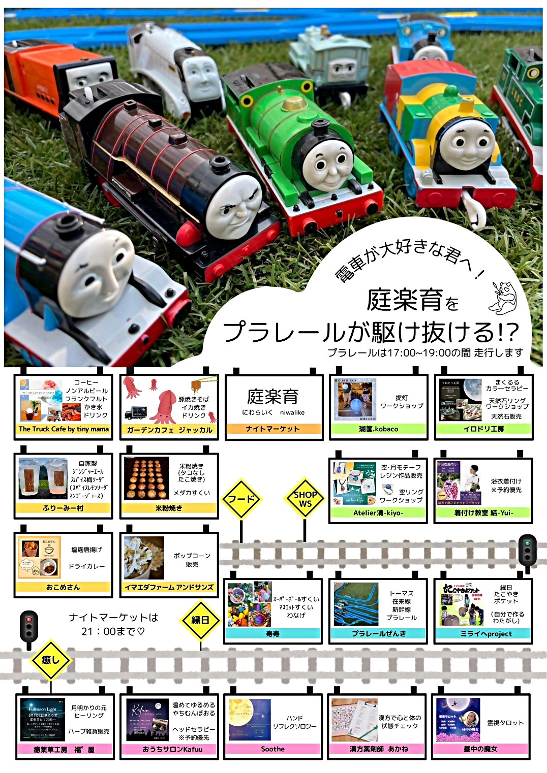 庭楽育にプラレールが走る線路が登場したり、子供縁日、飲食ブース、マッサージや占い、満月ヒーリングなど マルシェを行います。