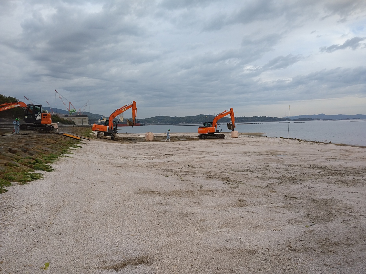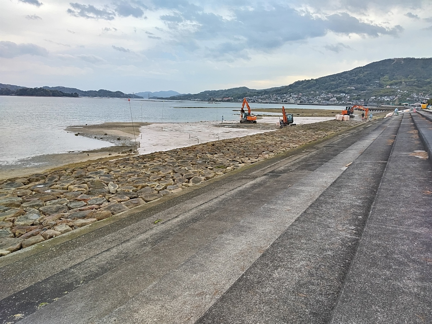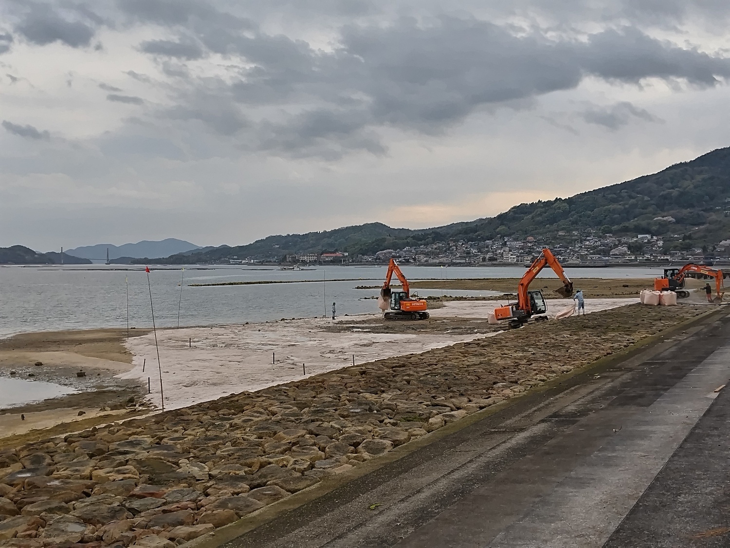 風早干潟での陸側からのカキ殻の施工が始まります(2025.4.28-5.2)。安全柵を設けて工事しますので、その外からなら見られます。なかなか壮大です。 | イベント情報