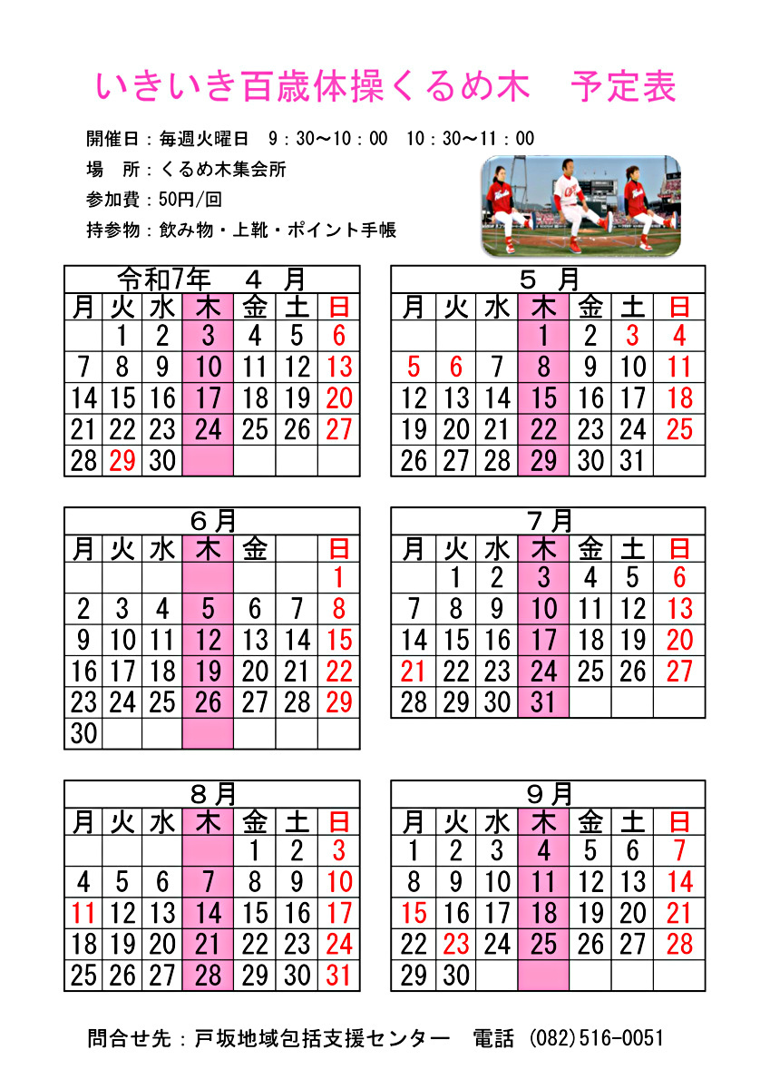 参加費:50円/回持参物:飲み物、上靴、いきいきポイント手帳