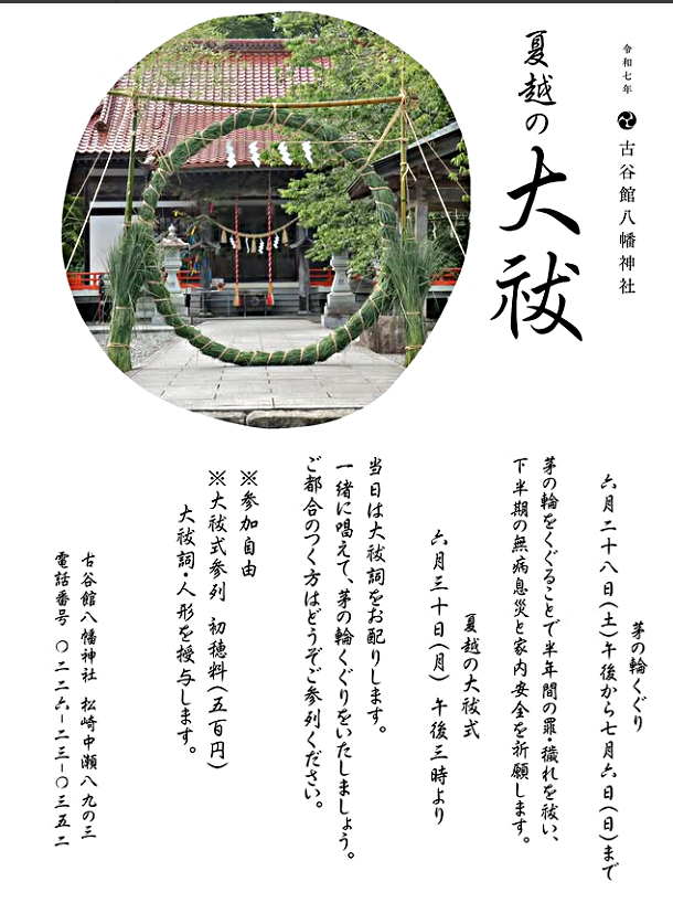 夏越の大祓は、上半期が終わる六月末に茅の輪をくぐって上半期の厄を落とし、下半期の無病息災を祈願する神事です。