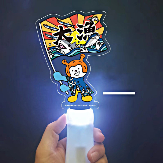 気仙沼みなとまつりにて販売する、ホヤぼーやを型どったピカピカ光るグッズです。