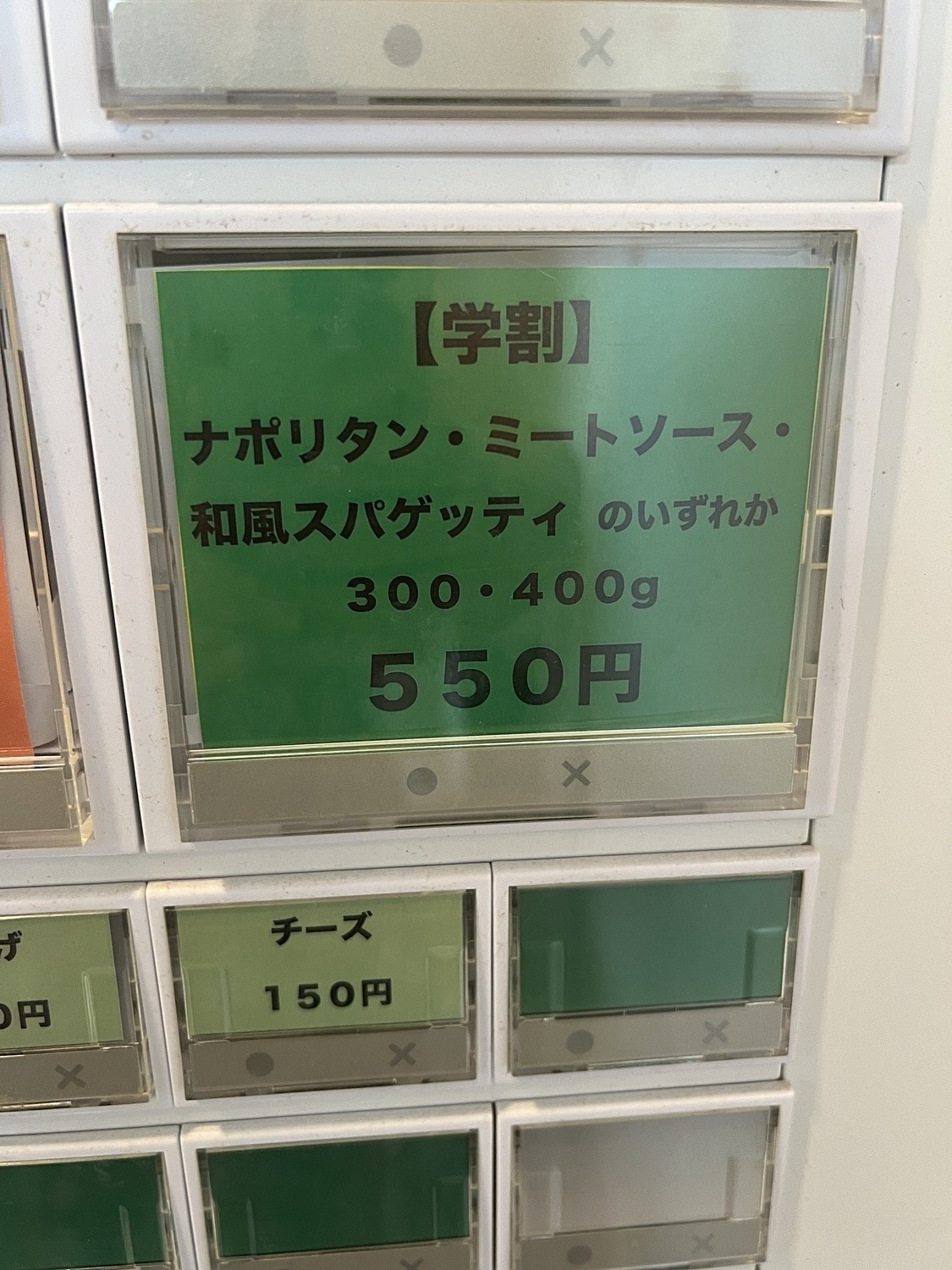 学生証ご提示で、ナポリタン、ミートソース、和風スパゲッティのいずれか一皿が550円となります。スパゲッティの量は300・400gから選べるので、お腹と相談して注文時に量をお伝えください。