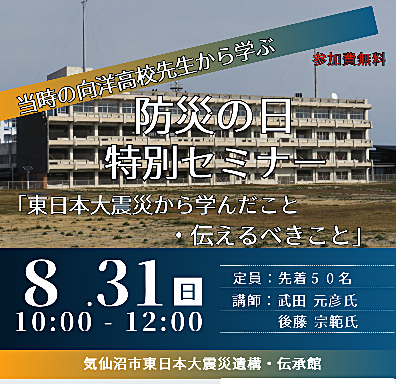 内容:9月1日「防災の日」に合わせ東日本大震災発生当時、気仙沼向洋高校の教頭だった武田元彦氏の講演会を開催します。