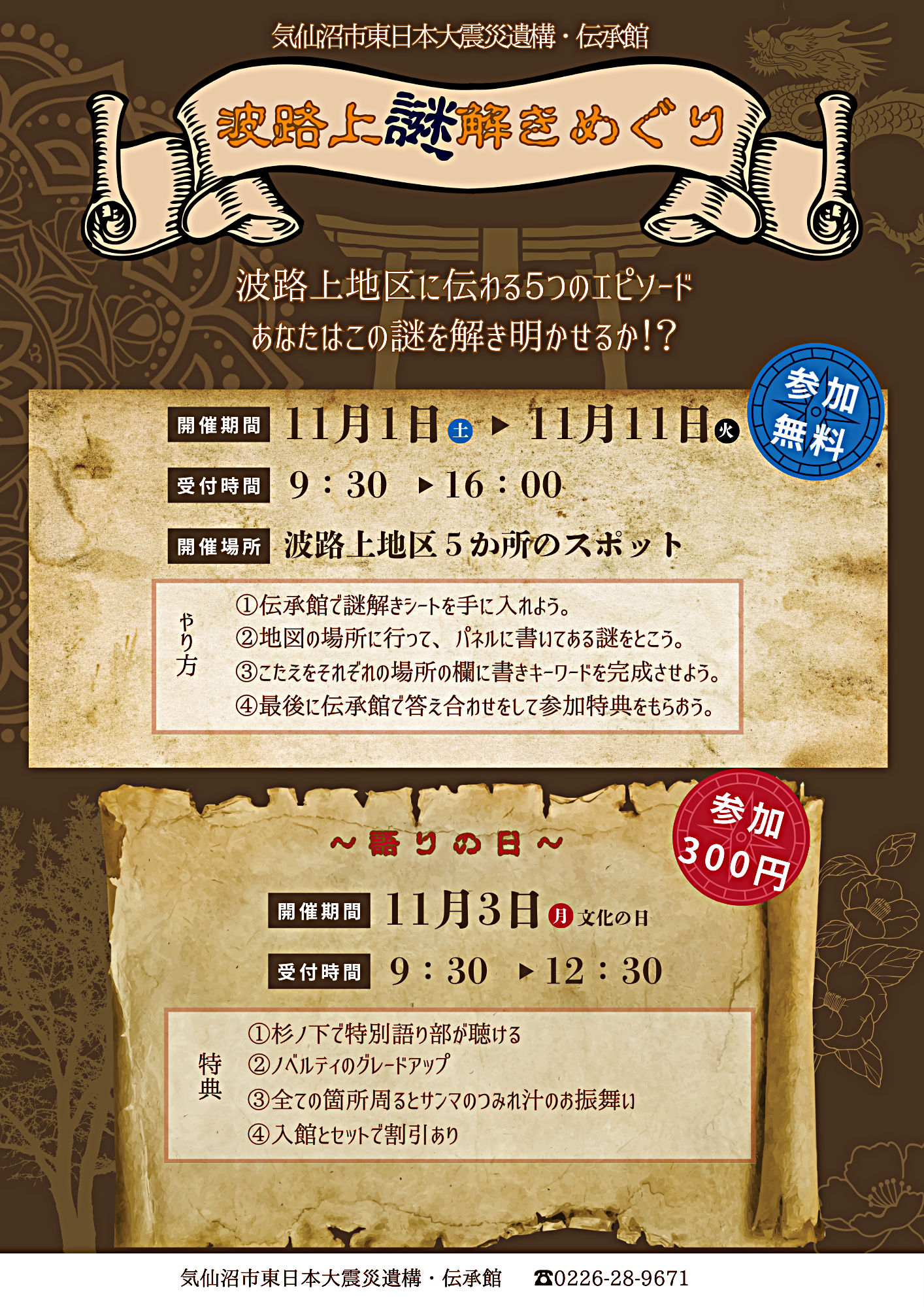 内容:震災で大きな被害を受けた波路上地区の5ヶ所(地福寺・杉ノ下慰霊碑・旭崎・岩井崎・琴平神社)に地震、津波に関するクイズを設置。5ヶ所巡ってもらった方には伝承館オリジナルグッズプレゼント。