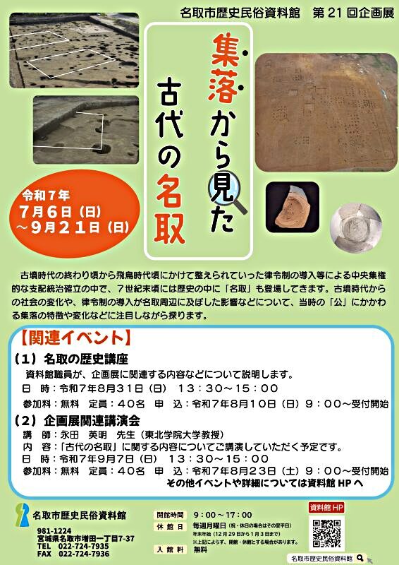 古墳時代の終わり頃から飛鳥時代頃にかけて整えられていった律令制の導入による中央集権的な支配統治確立の中で、7世紀末頃には歴史の中に「名取」も登場してきます。古墳時代からの社会の変化や、律令制の導入が名取周辺に及ぼした影響などについて、当時の「公」にかかわる集落などに注目しながら探ります。