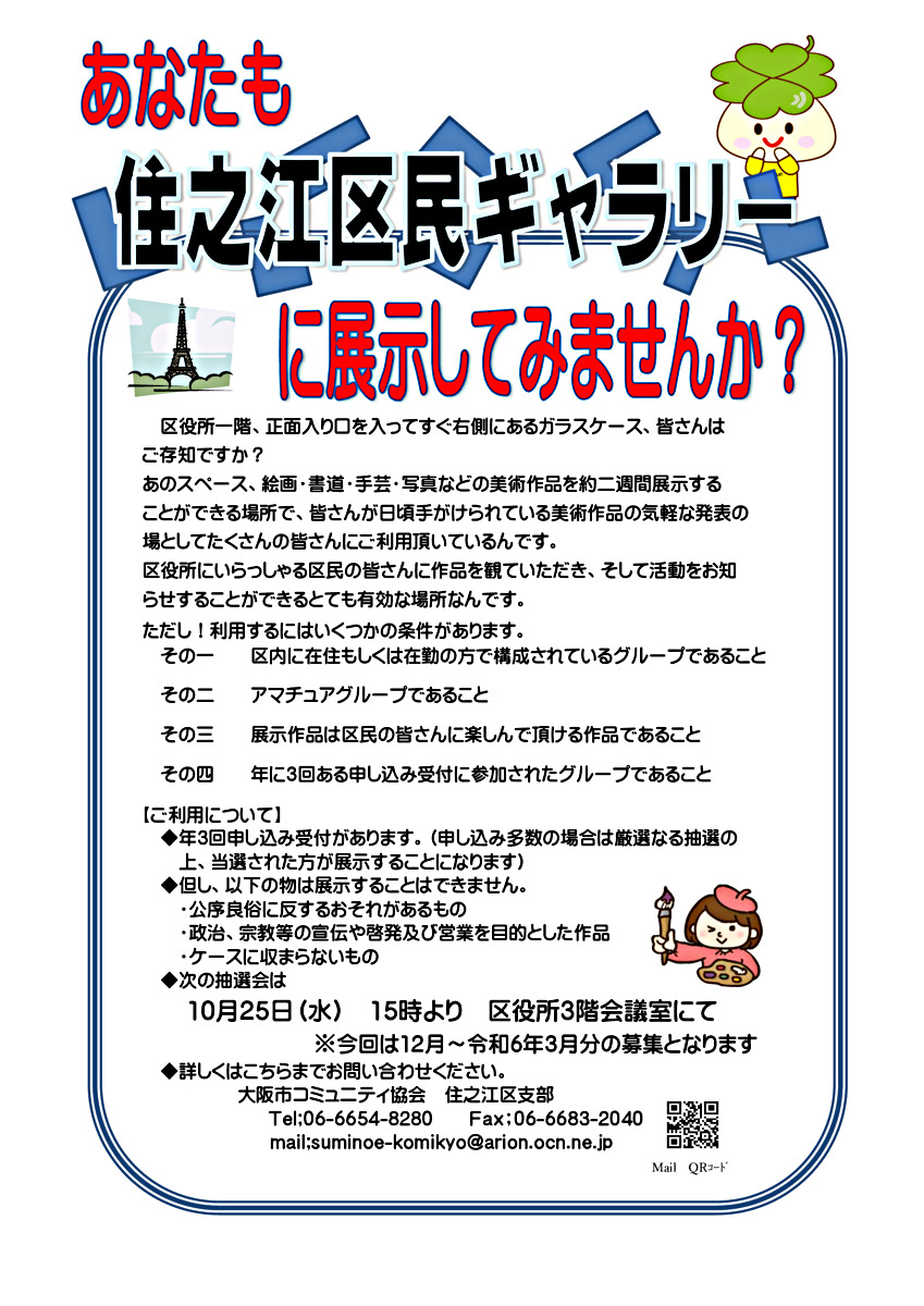 住之江区役所正面玄関入ってすぐ、右手にあるガラスケースにあなたの作品を展示してみませんか?
