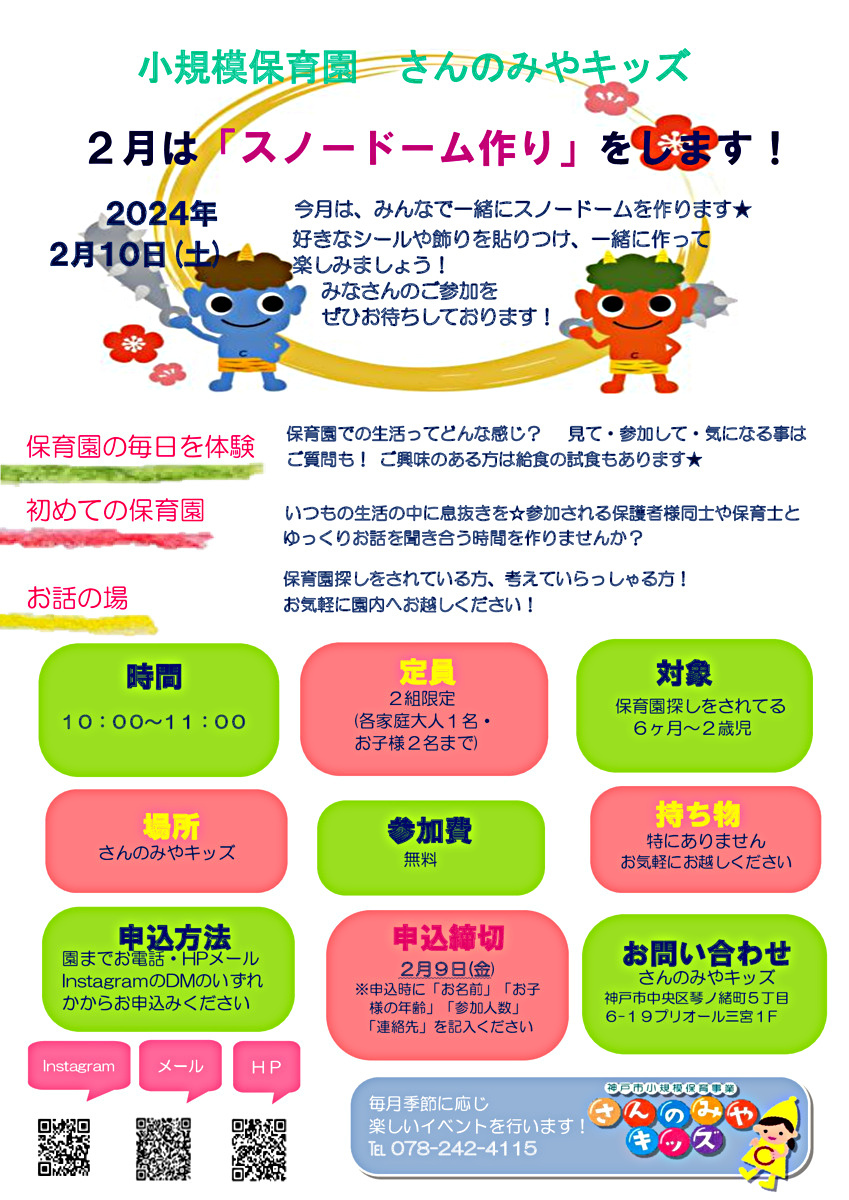 2月はみんなで「スノードーム」を作ります!シールや飾りを自由に貼りつけ、お家でも飾ってくださいね★ぜひ、ご参加お待ちしております☺