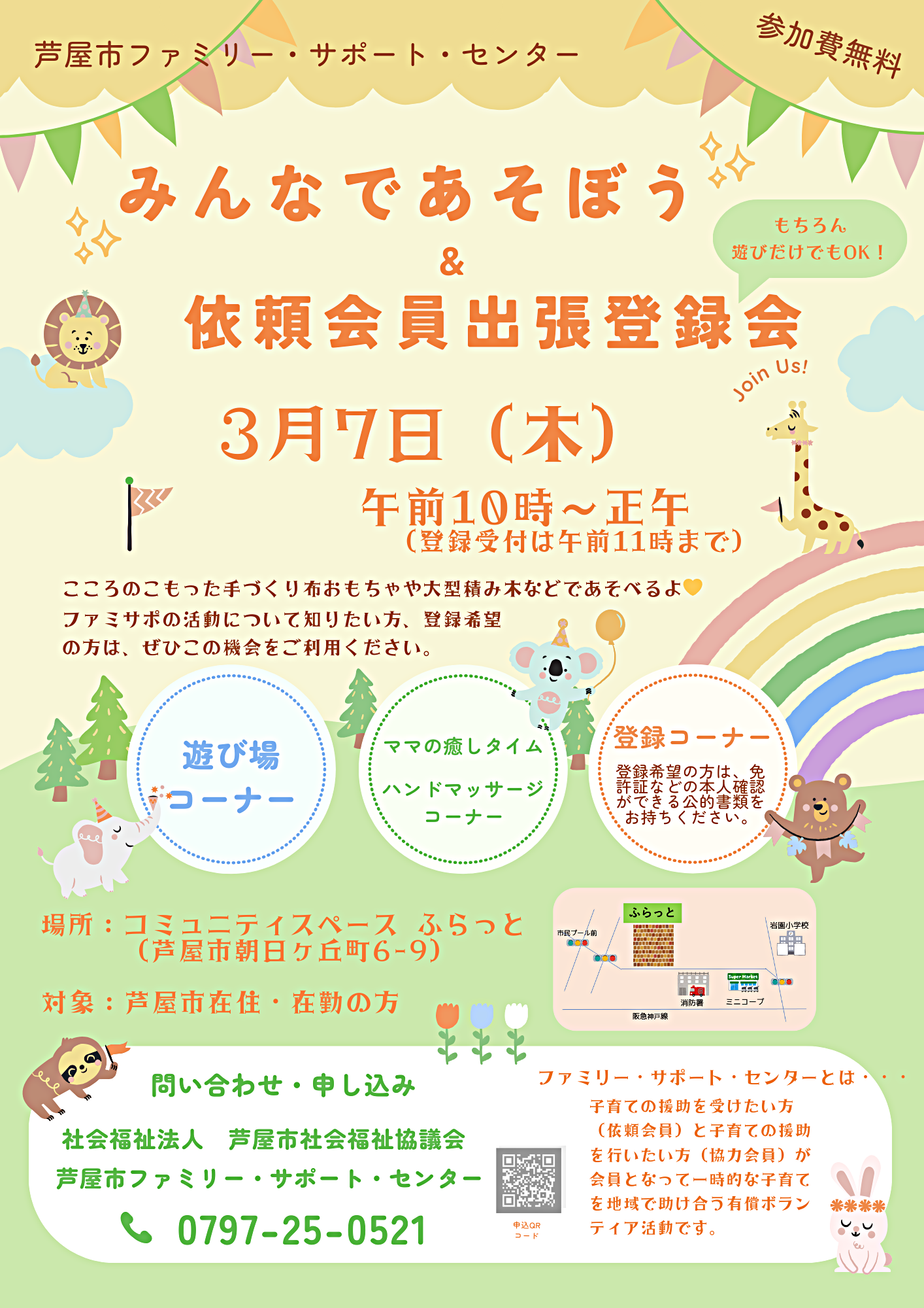 手づくり布おもちゃや大型積み木であそべるよ💛ファミサポの活動について知りたい方、登録希望の方は、ぜひこの機会をご利用ください。もちろん遊びだけ、ハンドマッサージだけでもOkです。ご参加をお待ちしています。