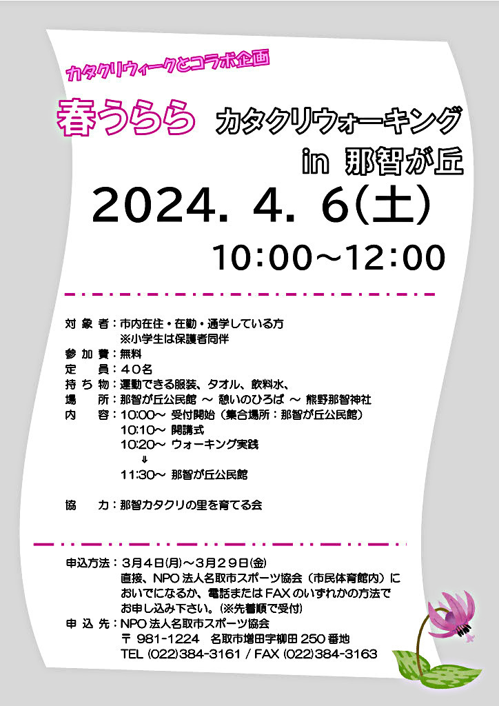 名取市スポーツ協会(市民体育館内)まで、来館していただくか、FAXまたは電話でお申し込みください。