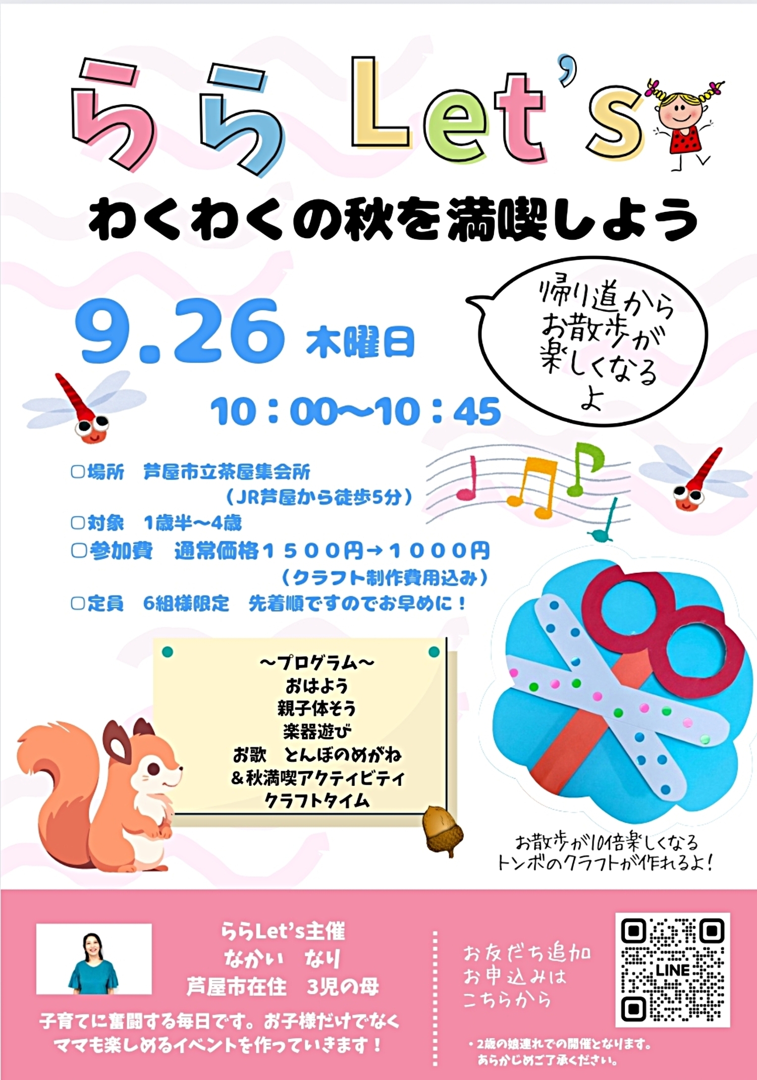お申し込みは、ららLet's 公式ラインhttps://lin.ee/VBngef3 よりお願いします。