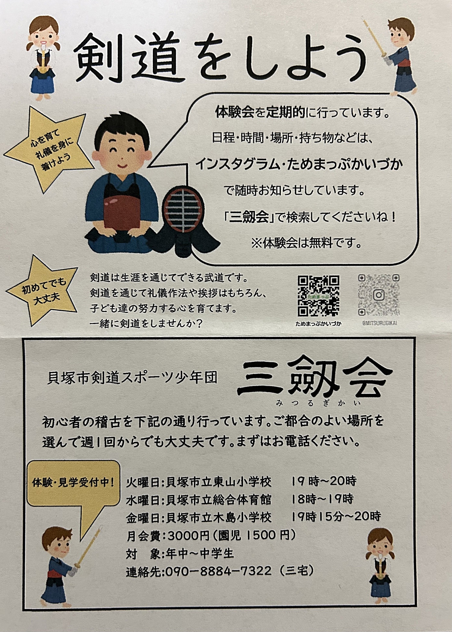 貝塚市立東山小学校他3か所で稽古を実施しています。お近くの稽古場にお越しください。まずはお電話ください。