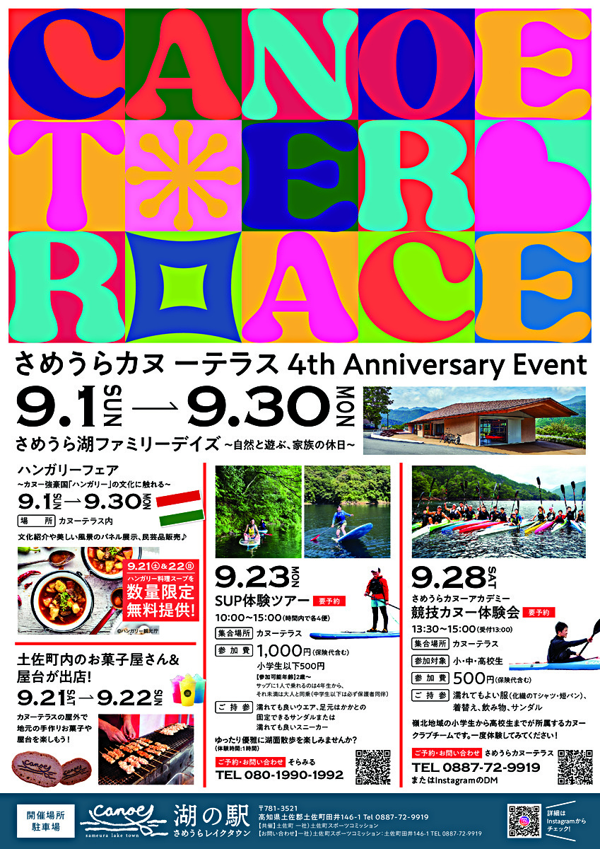 さめうらカヌーテラスが4周年を迎えることを記念して、9月1日から30日まで、特別なイベントを開催します!ぜひご家族や仲間と一緒に、楽しいひとときを過ごしに来てください!