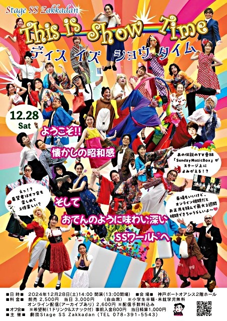 個性豊かな雑貨団のメンバーによる、昭和の歌・踊り・コントなど、目の前で繰り広げられる、臨場感溢れるお茶の間ステージショウ。子どもから大人まで楽しめる♪わくわくとドキドキがギュッと詰まった、ポップでハイブリッドなエンターテイメントショウです。アットホームで楽しい空間を、お客様と一緒にその場で創り上げる、年末バージョンです!
