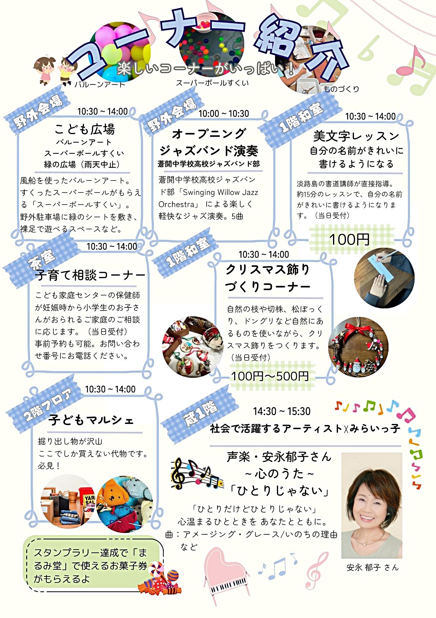 蒼開中学校高校ジャズバンド部の演奏で幕開け、スーパーボールすくいやバルーンアート、自分の名前がきれいに書けるようになる「美文字レッスン」、クリスマス飾りをつくるコーナーなど、楽しく、ためになるコーナーが各所に。