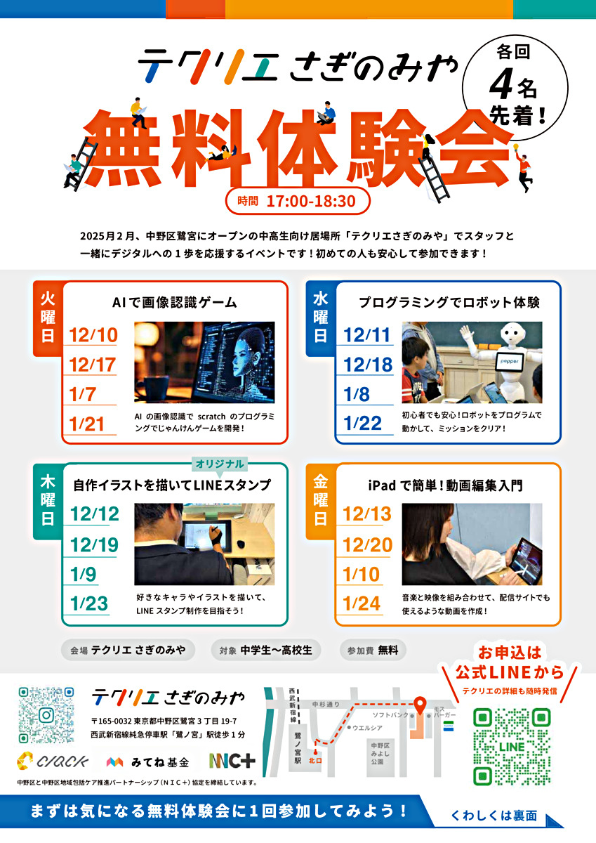 2025年2月、中野区鷺宮にオープンの中高生向け居場所「テクリエさぎのみや」でスタッフと一緒にデジタルへの1歩を応援するイベントです!初めての人も安心して参加できます!