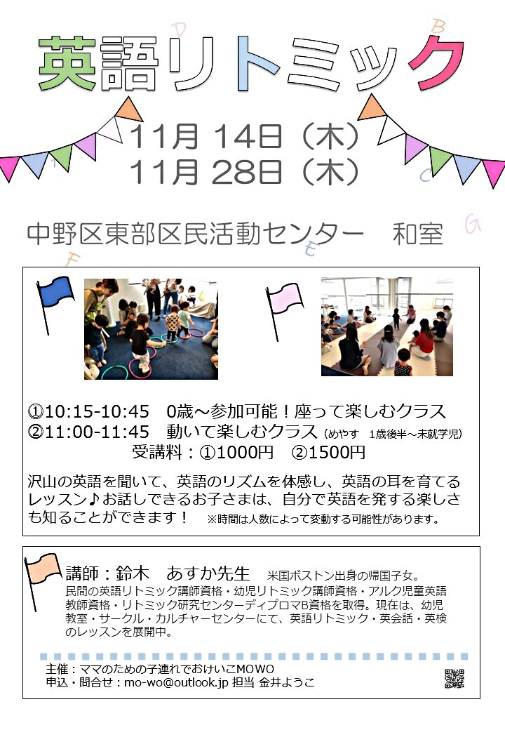 11月は、両日、東部区民活動センターで開催です。英語リトミックが終わったら、そのまま下にある子育てひろば「ぴよぴよ広場」へ遊びに行けます!!