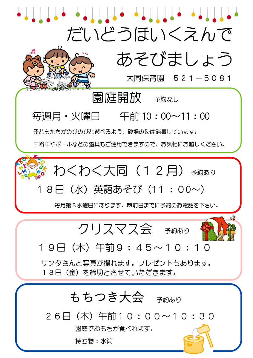 にこにこ大同、すくすく大同共にクリスマス気分を楽しめたらと思っています。是非お気軽に遊びに来てください。