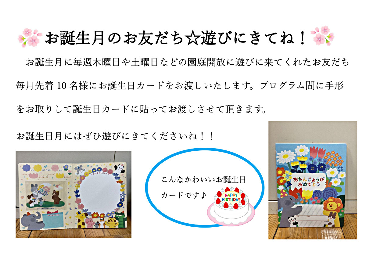 おかもと虹こども園です。今年度もお誕生月のお友だちに誕生日カードをプレゼント致します。お誕生月にもぜひおかもと虹こども園に遊びに来てくださいね!!