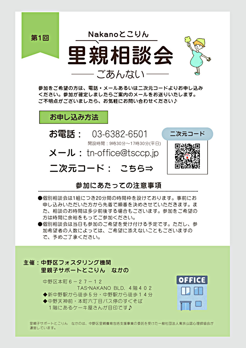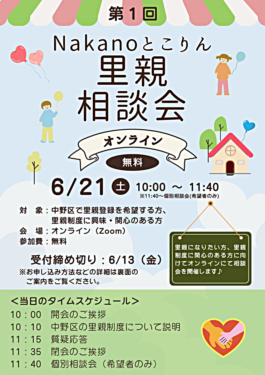 「Nakanoとこりん里親相談会」は、中野区で里親登録を希望する方、里親制度に興味・関心のある方に向けて、中野区の里親制度について知っていただける会です。今回は、オンライン(Zoom)にて開催します♪