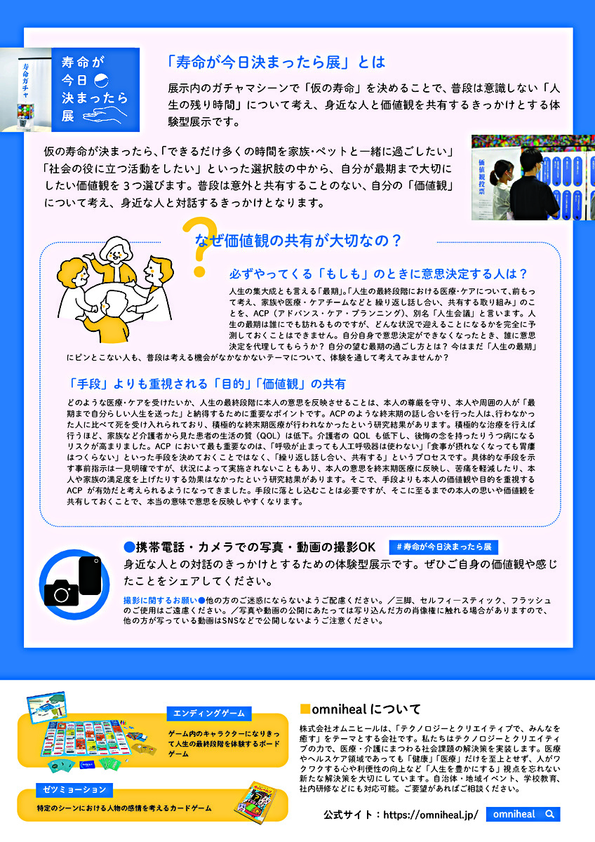 寿命が今日決まったら展は、健康成人向けの「一般的なACP」を早期から普及啓発する体験型展示です。展示内の「寿命ガチャ」によって決まる仮の「余命」で、普段は意識しない「人生の残り時間」について考えるきっかけとします。