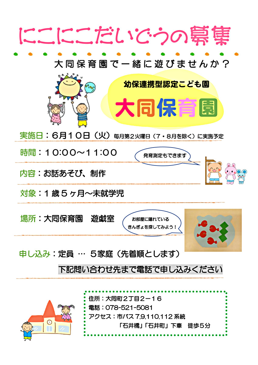 6月の「にこにこ大同」「すくすく大同」「わくわく大同」です。雨が続く季節になりますが、気持ちが晴れるような楽しい時間を過ごしましょう。ぜひ遊びに来てください!