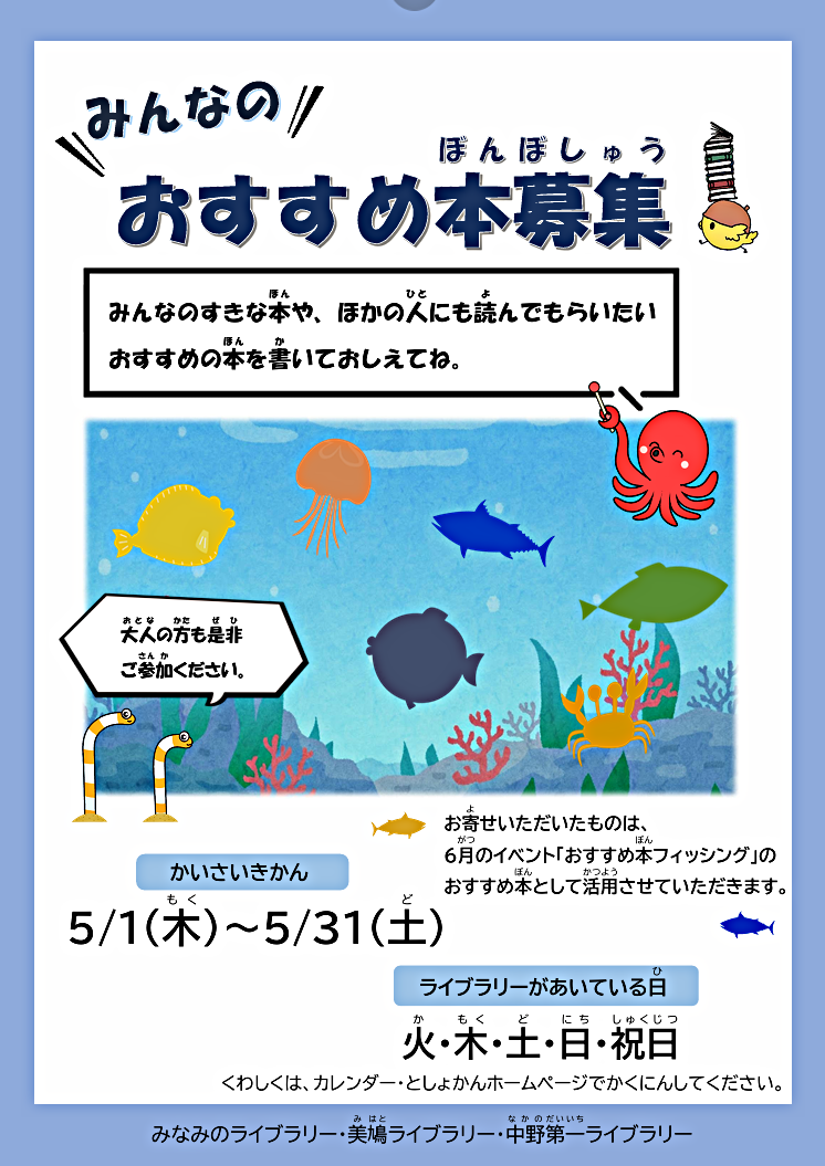お寄せいただいたものは、6月のイベント「おすすめ本フィッシング」のおすすめ本として活用させていただきます。