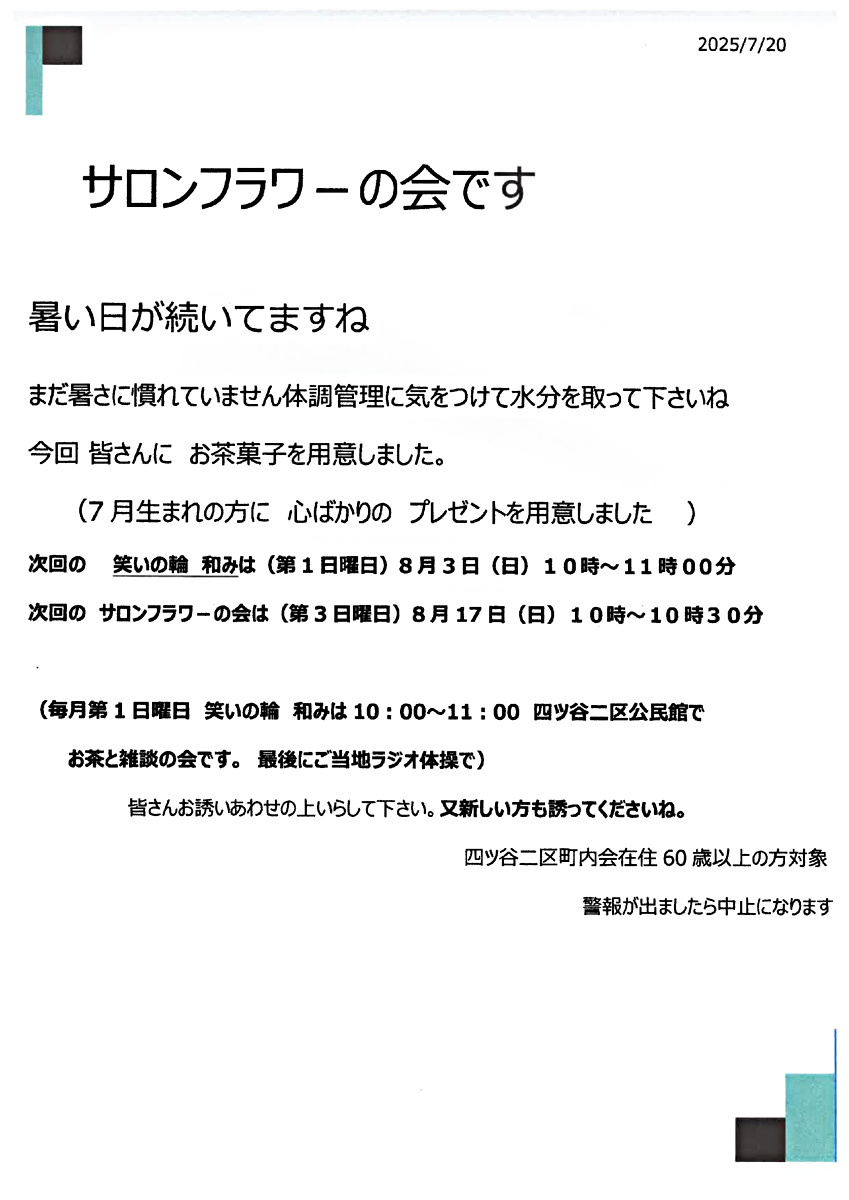 四ツ谷二区在住60歳以上の方が対象です。警報が出ましたら中止となります。