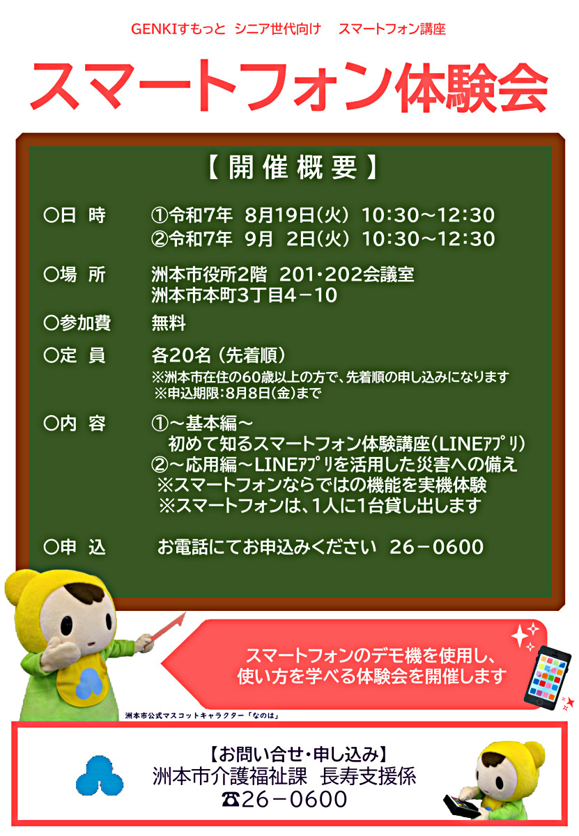 洲本在住の60歳以上を対象としたスマートフォン体験会(スマートフォン講座)を実施します。各日、定員20名(先着順)となっておりますので、お早めにお電話にてお申し込みください