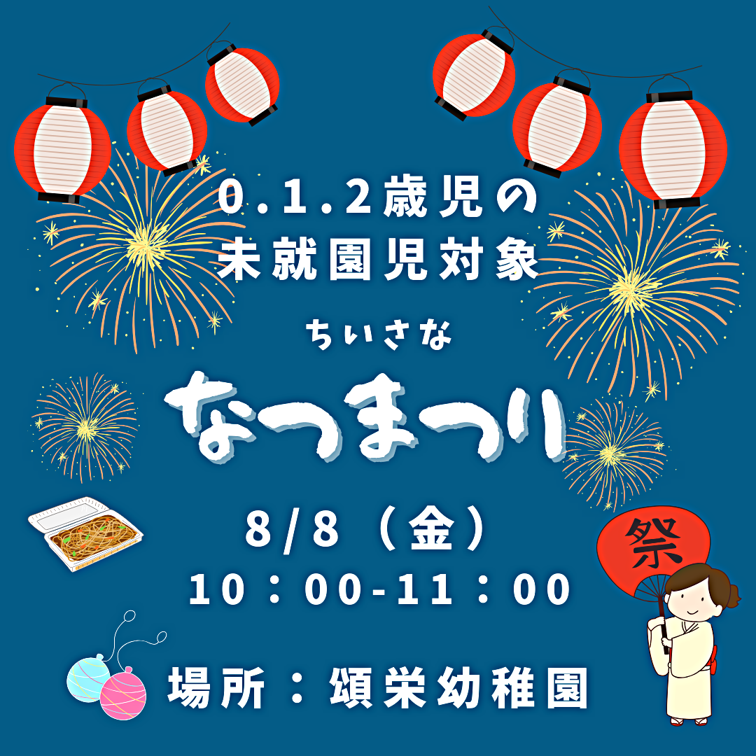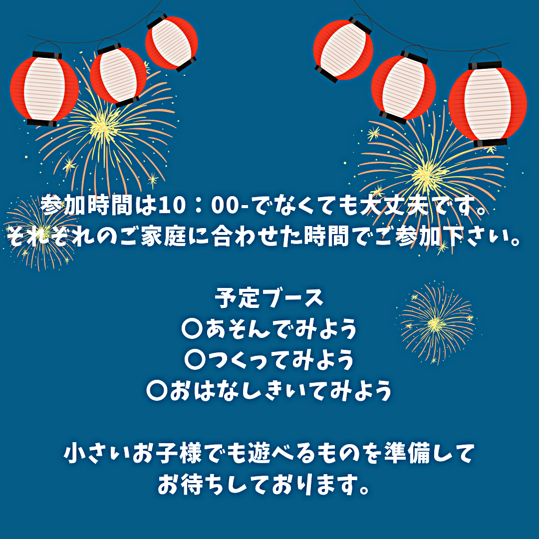 ちいさな夏祭りは要予約。普段の園庭開放は予約なしで大丈夫です。是非お越し下さい。