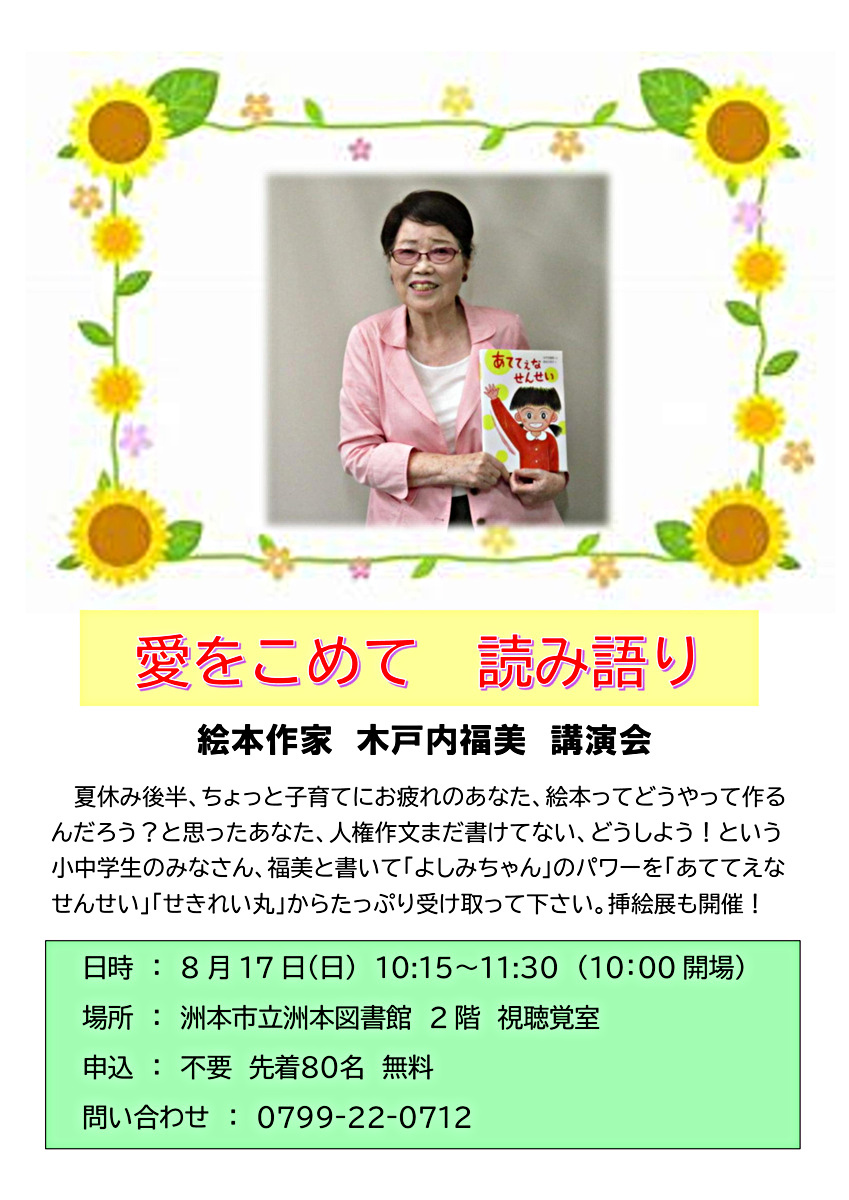 自作絵本「あててえな せんせい」「せきれい丸」他、木戸内さんおすすめ絵本の読み語りとお話。0歳から100歳まで、お越しの方の心に愛をお届けします。