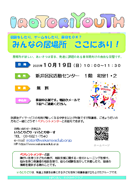 発達に課題がある、またはグレーゾーンのお子さんとご家族の居場所です。お茶をしたり、遊んだり、お子さんも親御さんも自由に過ごせます。ペアレントメンターが参加していますので、相談もできます。