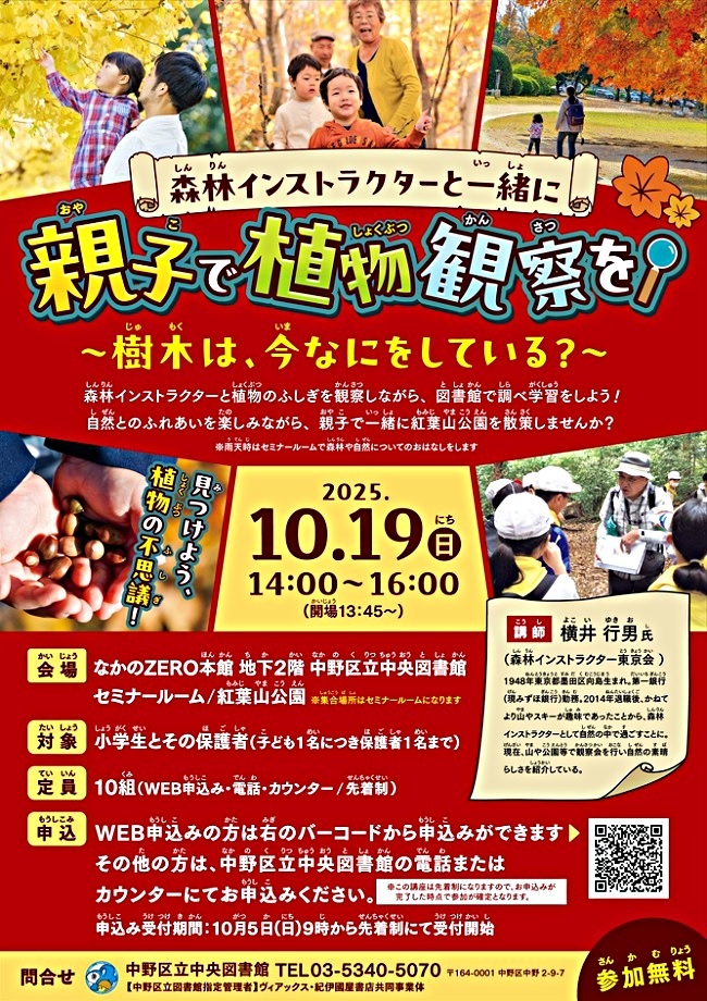 森林インストラクターと植物のふしぎを観察しながら、図書館で調べ学習をしよう!自然とのふれあいを楽しみながら、親子で一緒に紅葉山公園を散策しませんか?※雨天時はセミナールームで森林や自然についてのおはなしをします。虫よけスプレー・長袖・長ズボンの着用など、虫よけ対策をお願いします。