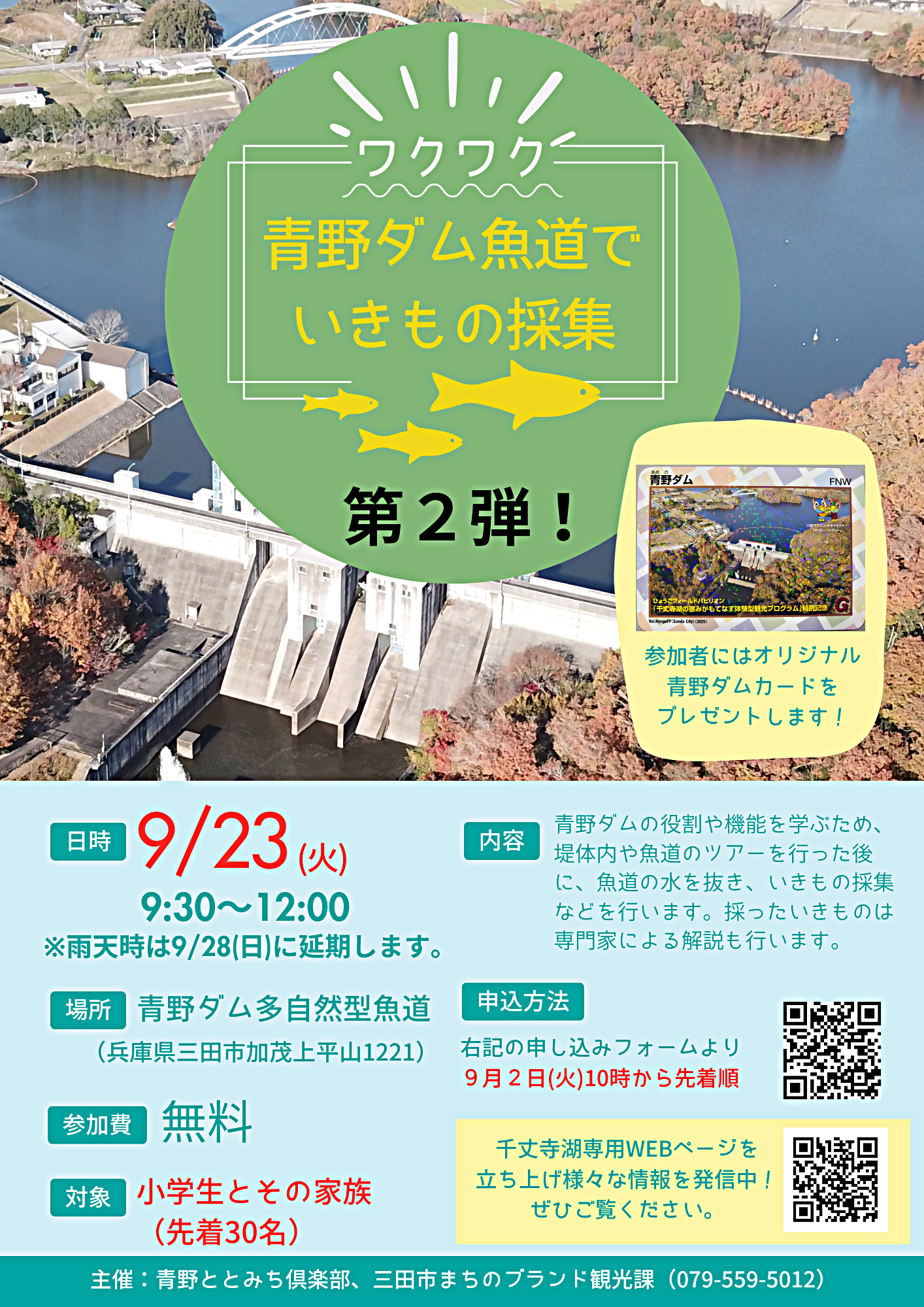 申し込み:9月2日(火曜日)10時から先着順で受け付けします。※定員に達し次第募集を終了します。参加辞退などがあった場合の再募集情報はここでお知らせします。「青野ダムのでいきもの採集」参加申込フォーム【定員に達したため募集を終了しました】