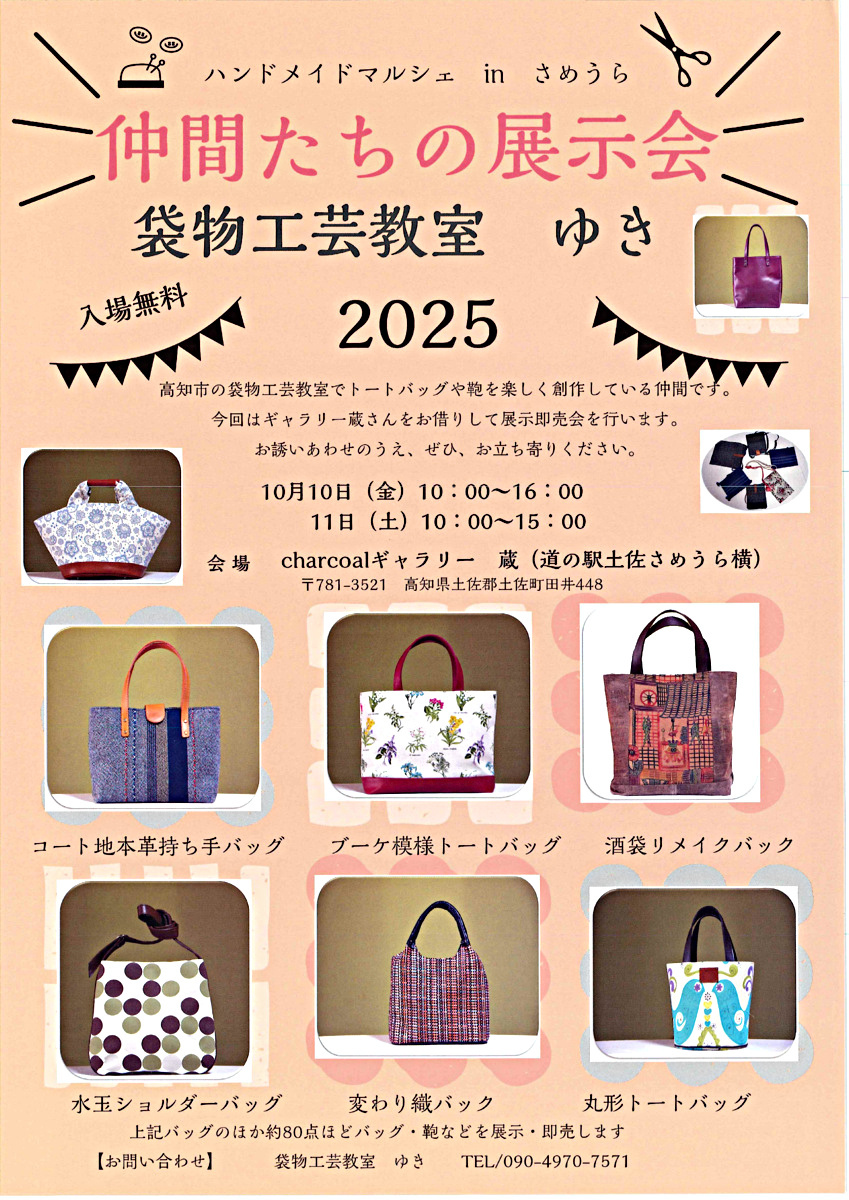 高知市の袋物工芸教室でトートバッグや靴を楽しく創作している仲間です。今回はギヤラリー蔵さんをお借りして展示即売会を行います。入場は無料。お誘いあわせのうえ、ぜひ、お立ち寄りください。