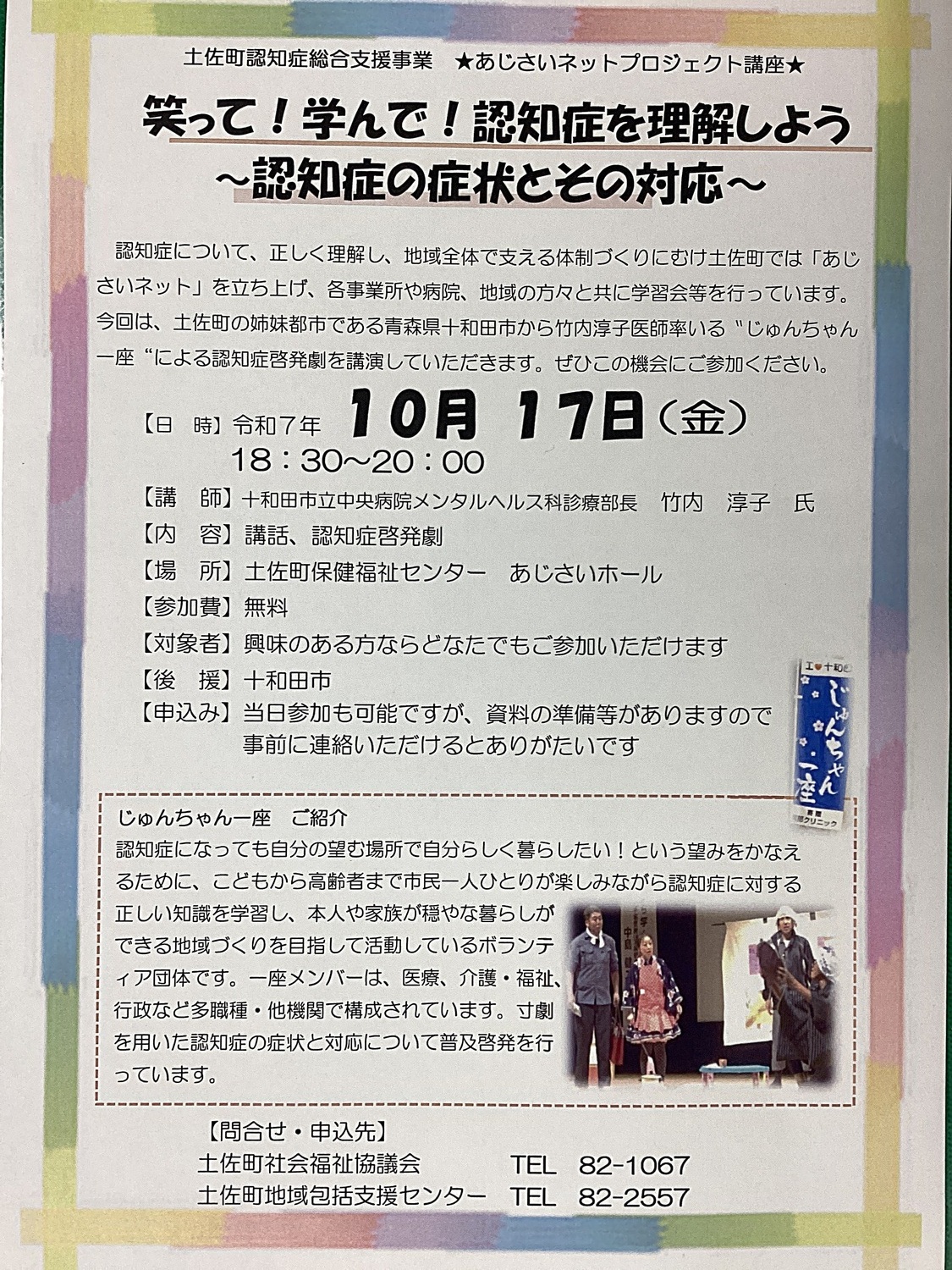 認知症について、正しく理解し地域全体で支える体制づくりに向けて、今回、土佐町の姉妹都市である青森県十和田市から「じゅんちゃん一座」が来町し、講演していただきます。ぜひご参加ください🙏