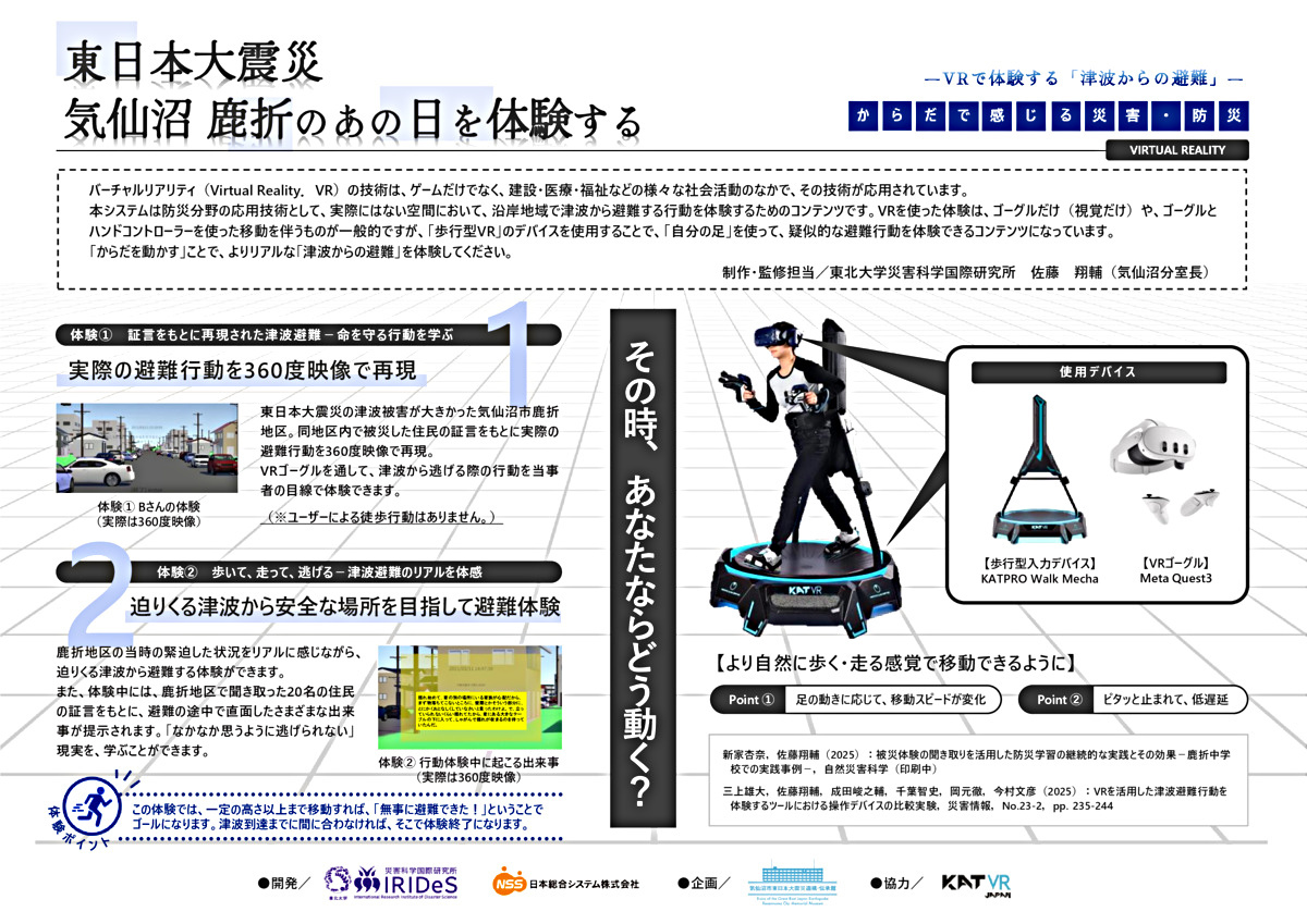 内容:①歩行型VRを使用して仮想空間で避難体験。②震災前の鹿折地区のジオラマや共徳丸の展示。※VR体験は11月5日(水)から可能。