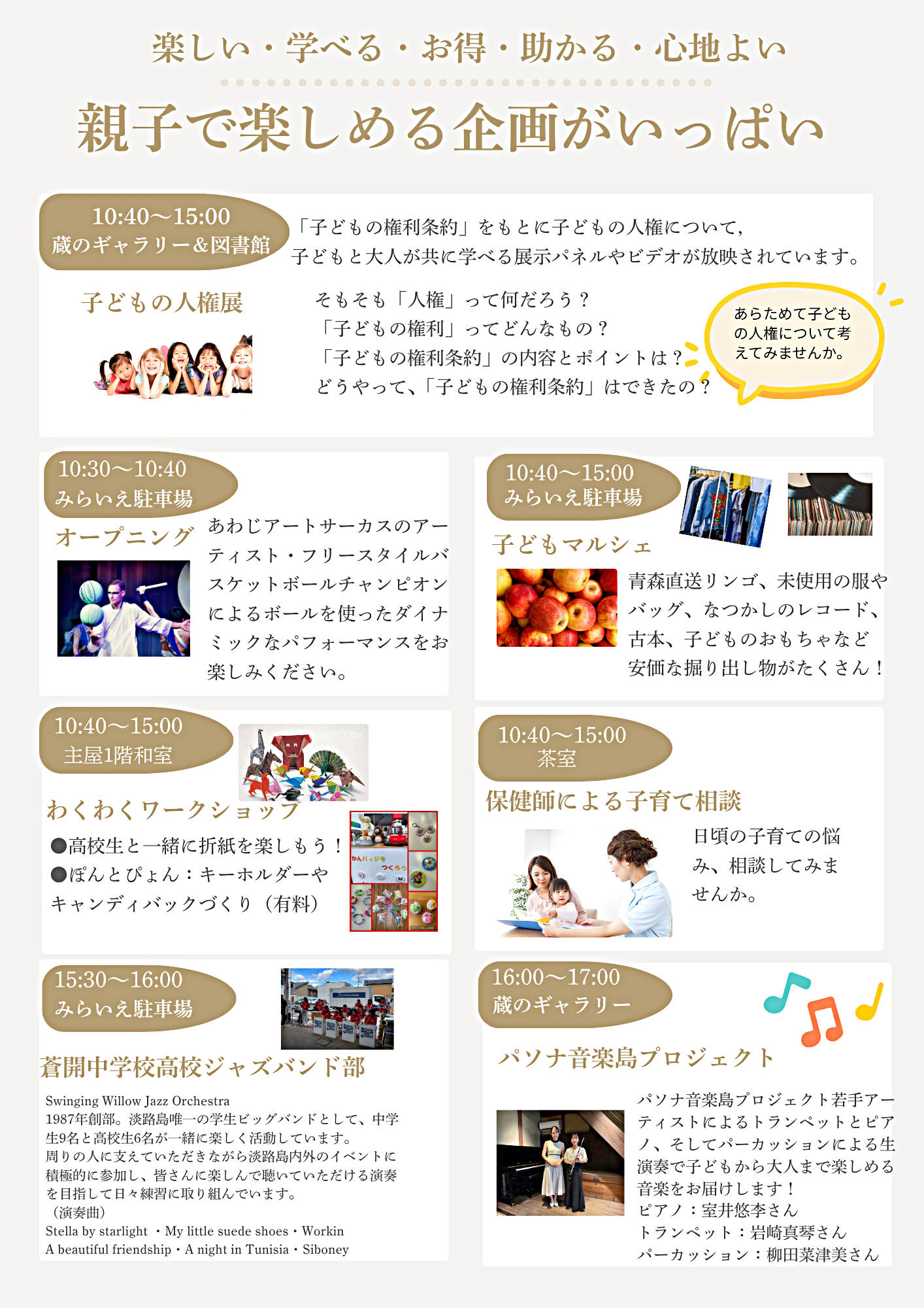 パソナ音楽島プロジェクト。トランペット、ピアノ、パーカッションによる生演奏で、子どもから大人まで楽しめる。